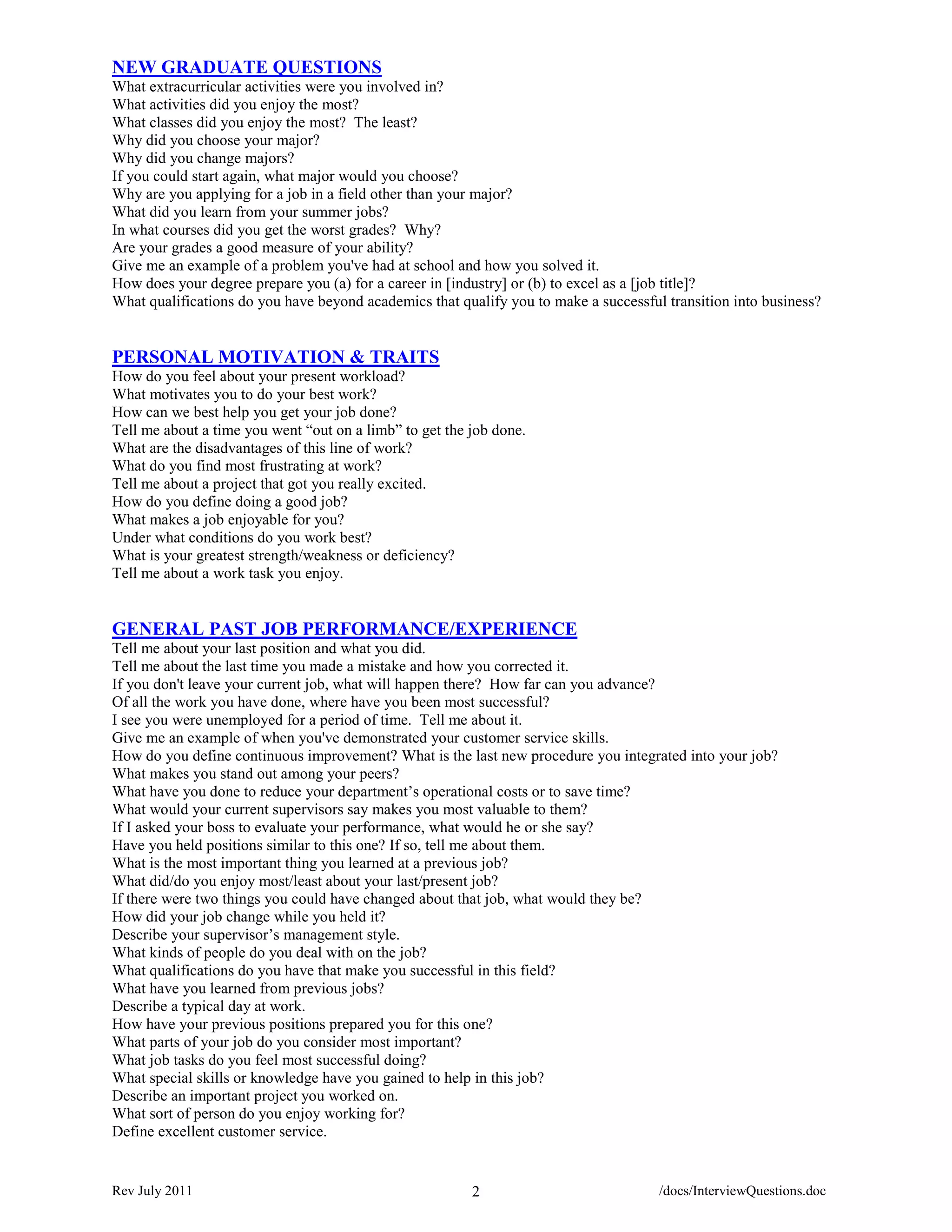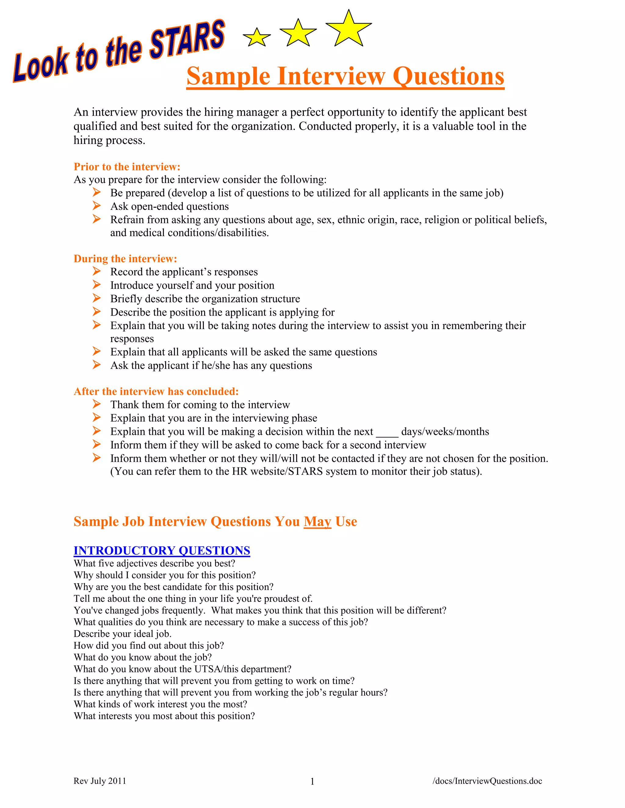 The document provides sample interview questions that can be used when conducting a job interview. It includes introductory questions, questions for new graduates, questions about personal motivation and traits, past job performance and experience, goals, software/technical skills, problem solving, communication, flexibility, stress, organization, cooperation with coworkers, manageability, decision making, and business ethics. The questions are intended to help the hiring manager evaluate the applicant's qualifications, skills, accomplishments, strengths and weaknesses.