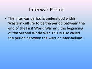The Interwar period between World War I and World War II saw many social, political, and economic changes. Women were granted suffrage, new inventions like cars and airplanes emerged, and the Great Depression started with the 1929 stock market crash, plunging many into poverty. The Treaty of Versailles officially ended WWI but its terms dissatisfied many. The interwar years also saw the rise of prohibition, mass immigration, and racial segregation before culminating in the outbreak of World War II.