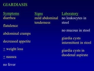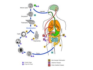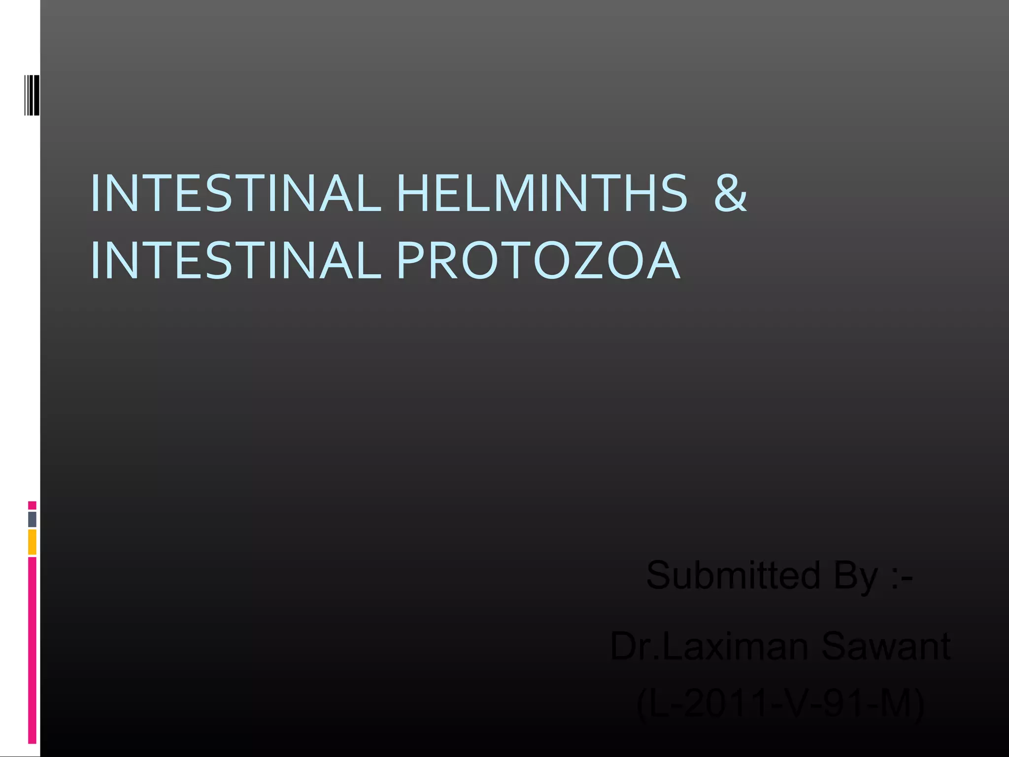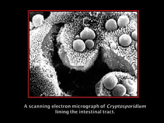 The document discusses several intestinal protozoa and helminths including Ascaris lumbricoides, hookworms, Entamoeba histolytica, Giardia lamblia, and Cryptosporidium. It describes the morphology, life cycles, transmission routes, clinical manifestations, diagnosis, and treatment of each parasite. Prevention focuses on proper sanitation, hygiene practices like handwashing, water treatment, and health education.