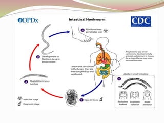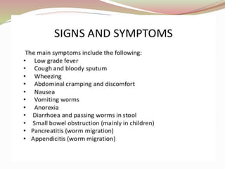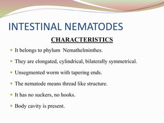The document provides a detailed overview of intestinal nematodes, focusing on their characteristics, life cycles, and specific types like Ascaris lumbricoides and Ancylostoma duodenale. It discusses their morphology, modes of transmission, clinical features, laboratory diagnosis, treatment, and preventive measures. Nematodes are described as thread-like structures with separate sexes, and the document highlights the prevalence of these infections, particularly in underdeveloped regions.