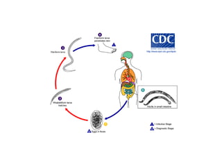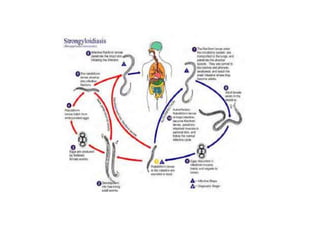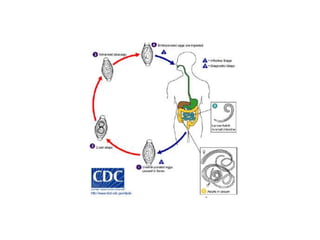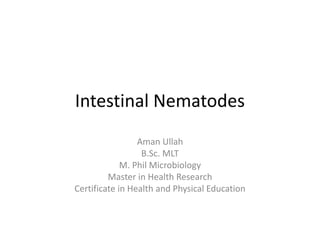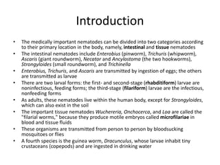 The document discusses several intestinal nematodes (roundworms) that infect humans, including their life cycles, transmission, pathogenesis, clinical findings, and diagnosis. It covers Enterobius (pinworm), Trichuris (whipworm), Ascaris (giant roundworm), hookworms (Necator and Ancylostoma), and Strongyloides. The nematodes have complex life cycles involving egg and larval stages, with transmission occurring through ingestion of eggs or larval penetration of skin. Symptoms range from pruritus to diarrhea and anemia. Diagnosis involves microscopic identification of eggs in stool samples, with larvae seen in stool for Strongyloides.