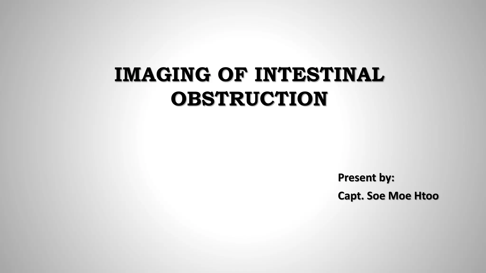The document provides information on imaging of intestinal obstruction. It discusses the types, causes, clinical presentations and imaging features of small bowel obstruction and large bowel obstruction. Key points include that small bowel obstruction is more common and can be caused by adhesions, hernias and tumors. Imaging findings on x-ray include dilated bowel loops and air-fluid levels. Closed loop obstruction has a characteristic "U-shaped" bowel configuration. Large bowel obstruction is usually due to cancer in adults. Common causes of neonatal bowel obstruction discussed include duodenal atresia, jejunal atresia, ileal atresia, meconium ileus and Hirschsprung's disease.