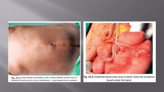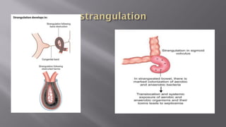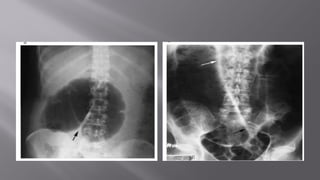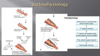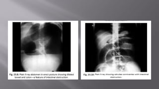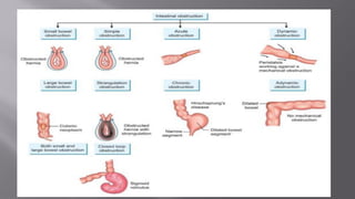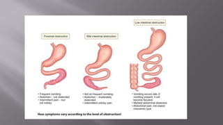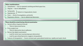 - Management involves antibiotics, electrolyte correction, and determining whether surgery or non-operative treatment is indicated based on the type and severity of obstruction. Immediate surgery is needed for suspected ischemia, large bowel obstruction, or