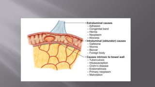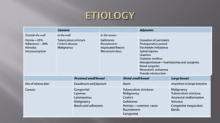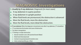 This document discusses the cardinal features, investigative findings, classification, and management of intestinal obstruction. It provides details on:
