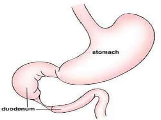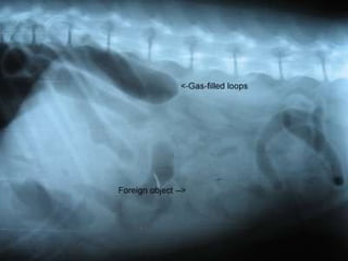 The document summarizes intestinal obstruction in animals, including its classification, signs, diagnosis, and treatment. Intestinal obstruction can be mechanical, functional, intraluminal, intramural, or congenital. Signs depend on the location and severity of the obstruction. Diagnosis involves history, clinical examination, imaging like radiography and ultrasound, and laboratory tests. Treatment involves fluid therapy, surgery to remove obstructions, and managing complications like strangulation and peritonitis.