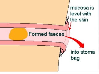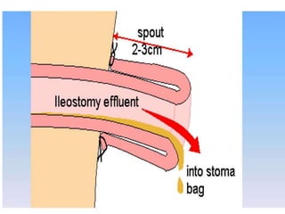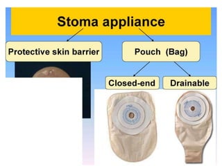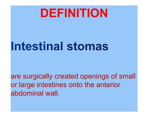 This document provides information on different types of intestinal stomas including definitions, principles of formation, and details on specific stomas like ileostomy and colostomy. It discusses how stomas are formed, attached, common complications, and dietary advice for stoma patients. Loop stomas are described as the most common type and are usually temporary to divert the fecal stream for procedures like anastomosis or fistula repairs. End stomas can be permanent outcomes of surgeries like colectomies or used temporarily in emergency settings. Proper stoma care and appliance attachment is covered along with managing common issues.