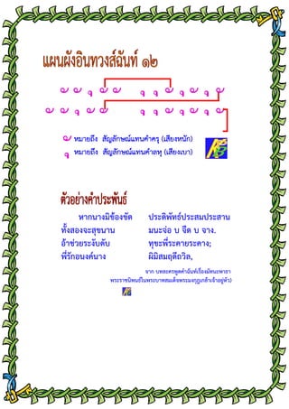 อินทวงสฉันท (อานวา อิน-ทะ-วง-ฉัน) อินท ตามความหมายในพจนานุกรม ฉบับราชบัณฑิตยสถาน หมายถึง ชื่อเทวราชผูเปนใหญในสวรรคชั้นดาวดึงสและชั้นจาตุ มหาราช อินทวงสฉันท จึงมีความหมายวา “ฉันทที่มีทวงทํานองลีลาดุจอินทวงส เทวราช” คณะและพยางค อินทวงสฉันท ๑ บท ประกอบดวยคณะและพยางค ดังนี้ มี ๒ บาท วรรคหนามีจํานวน ๕ คํา/พยางค และวรรคหลังมีจํานวน ๗ คํา/ พยางค ๑ บาท นับจํานวนคําได ๑๒ คํา/พยางค ดังนั้น จึงเขียนเลข ๑๒ หลังชื่อ อินทวงสฉันท นี่เองครับ ทั้งบทมีจํานวนคําทั้งสิ้น ๒๔ คํา สัมผัส พบวา สัมผัสอินทวงสฉันท มีสัมผัสนอก (ที่เปนสัมผัสภายในบท) จํานวน ๒ แหง ไดแก ๑. คําสุดทายของวรรคที่ ๑ (วรรคหนา บาทที่ ๑) สงสัมผัสกับคําที่ ๓ ของวรรคที่ ๒ (วรรคหลัง บาทที่ ๑) ๒. คําสุดทายของวรรคที่ ๒ (วรรคหลัง บาทที่ ๑) สงสัมผัสกับคํา สุดทาย ของวรรคที่ ๓ (วรรคหนา บาทที่ ๒) สัมผัสระหวางบท พบวา คําสุดทายของบท สงสัมผัสกับคําสุดทายของวรรคที่ ๒ (วรรคหลัง บาทที่ ๑) ในบทตอไป คําครุ ลหุ อินทวงสฉันท ๑ บท มีคําครุทั้งหมด ๑๔ และมีคําลหุทั้งหมด ๑๐ คํา ใหนักเรียนสังเกตสัมผัสบังคับ (สัมผัสนอก) และบังคับครุ-ลหุ อินทวงสฉันท ๑๒ ตามผังภาพ คําครุ สัญลักษณแทนดวย ั คําลหุ สัญลักษณแทนดวย ุ ใหนักเรียนดูตัวอยางตามผังภาพ ครับ