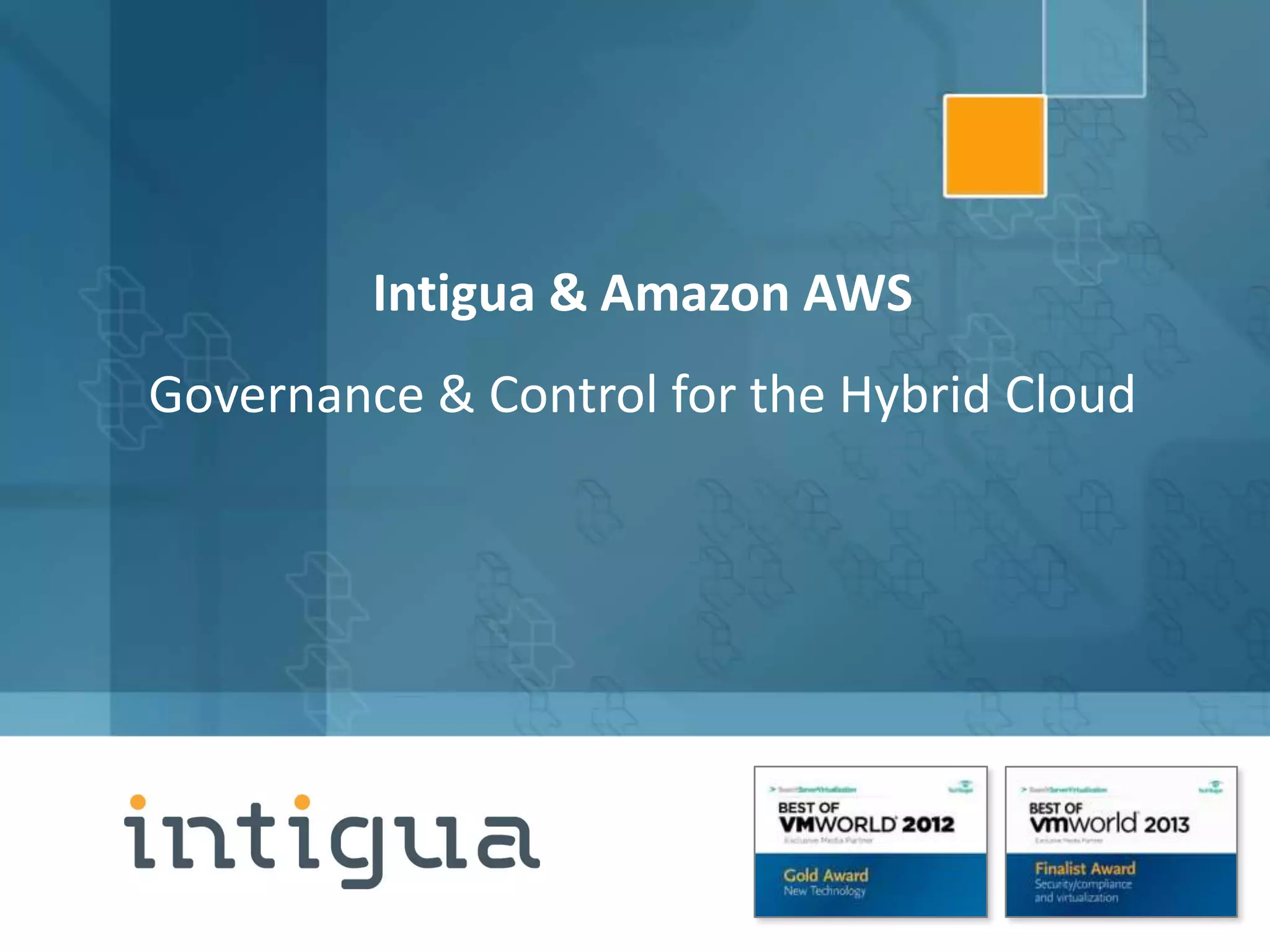 This document discusses Intigua, a company that provides a solution to modernize operational management stacks for hybrid clouds. Intigua enables governance and control while allowing for cloud-speed automation. It simplifies IT operations management and enables it to be delivered at AWS speed through centralized, policy-based automation across physical, private, and public cloud workloads. Intigua helps achieve continuous compliance for workloads on both public and private clouds through automatic discovery, configuration, and monitoring based on tags and profiles.