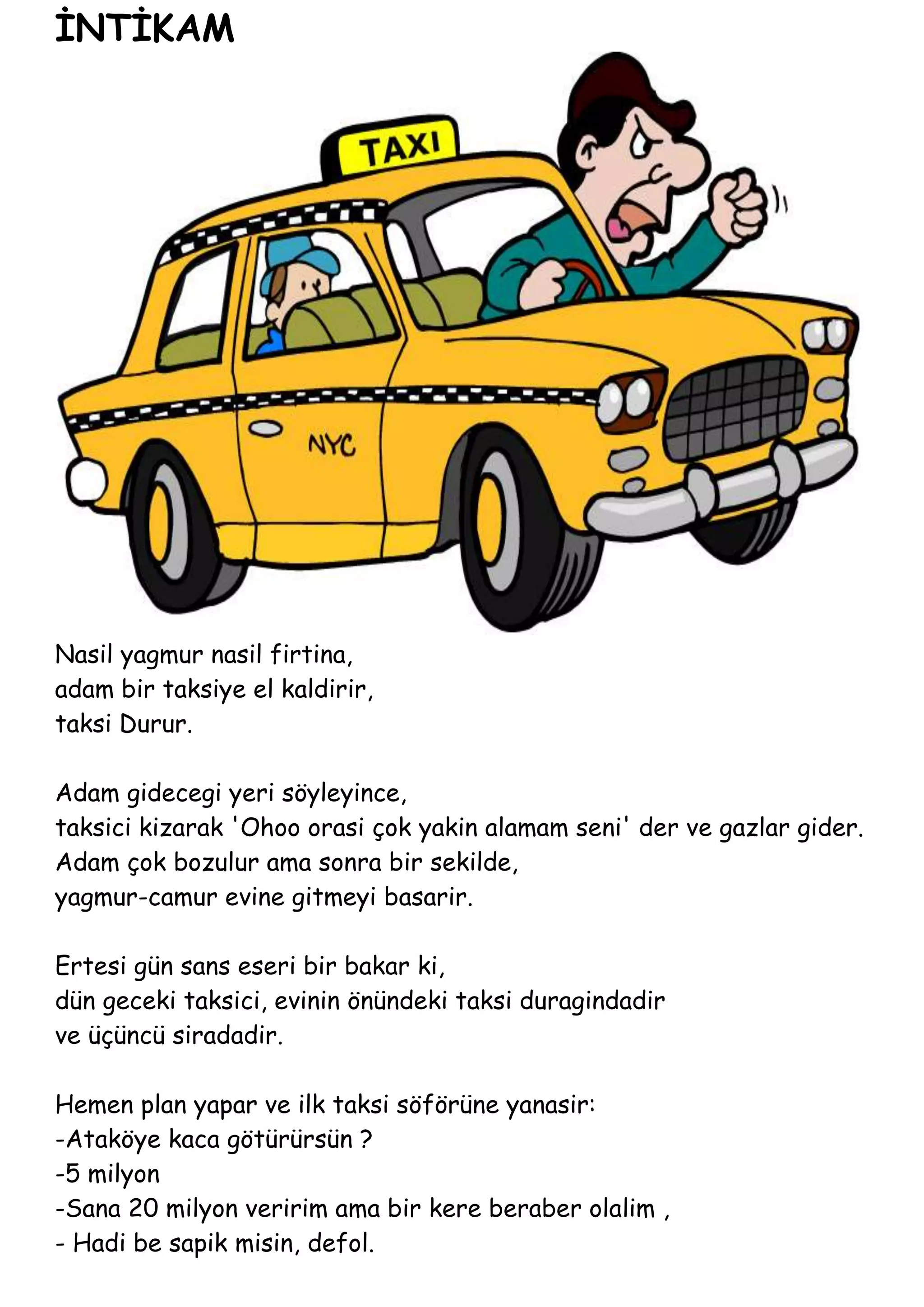 Adam bu cevabialinca ikinci siradaki taksiye yanasir.