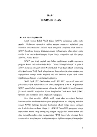 Dokumen ini membahas pentingnya nomor pokok wajib pajak (NPWP) dan dampak hukumnya bagi wajib pajak yang tidak memilikinya, termasuk diskriminasi tarif pajak yang lebih tinggi. Diskriminasi tarif pajak ini diterapkan sesuai dengan undang-undang pajak penghasilan terbaru yang menunjukkan bahwa individu tanpa NPWP akan dikenakan tarif lebih tinggi, misalnya, pajak penghasilan (PPh) yang sebesar 20% lebih tinggi. Tujuan dari peraturan ini adalah untuk mendorong kepatuhan wajib pajak dalam hal kepemilikan NPWP dan mengurangi penghindaran pajak.