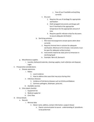 1. The document provides guidelines for international spay/neuter field clinics, covering topics such as pre-operative planning, supplies, surgical protocols, anesthesia, post-operative care, and recovery monitoring. 2. Proper sterilization of instruments and maintaining aseptic technique during surgery are emphasized as critical for reducing post-operative complications. 3. Thermoregulation of patients is identified as a major concern, as hypothermia is a common post-operative complication; keeping patients warm and dry during and after surgery is advised.
