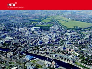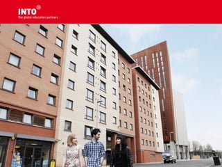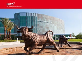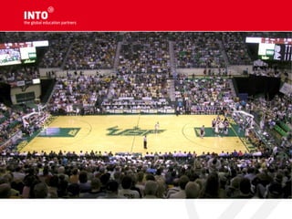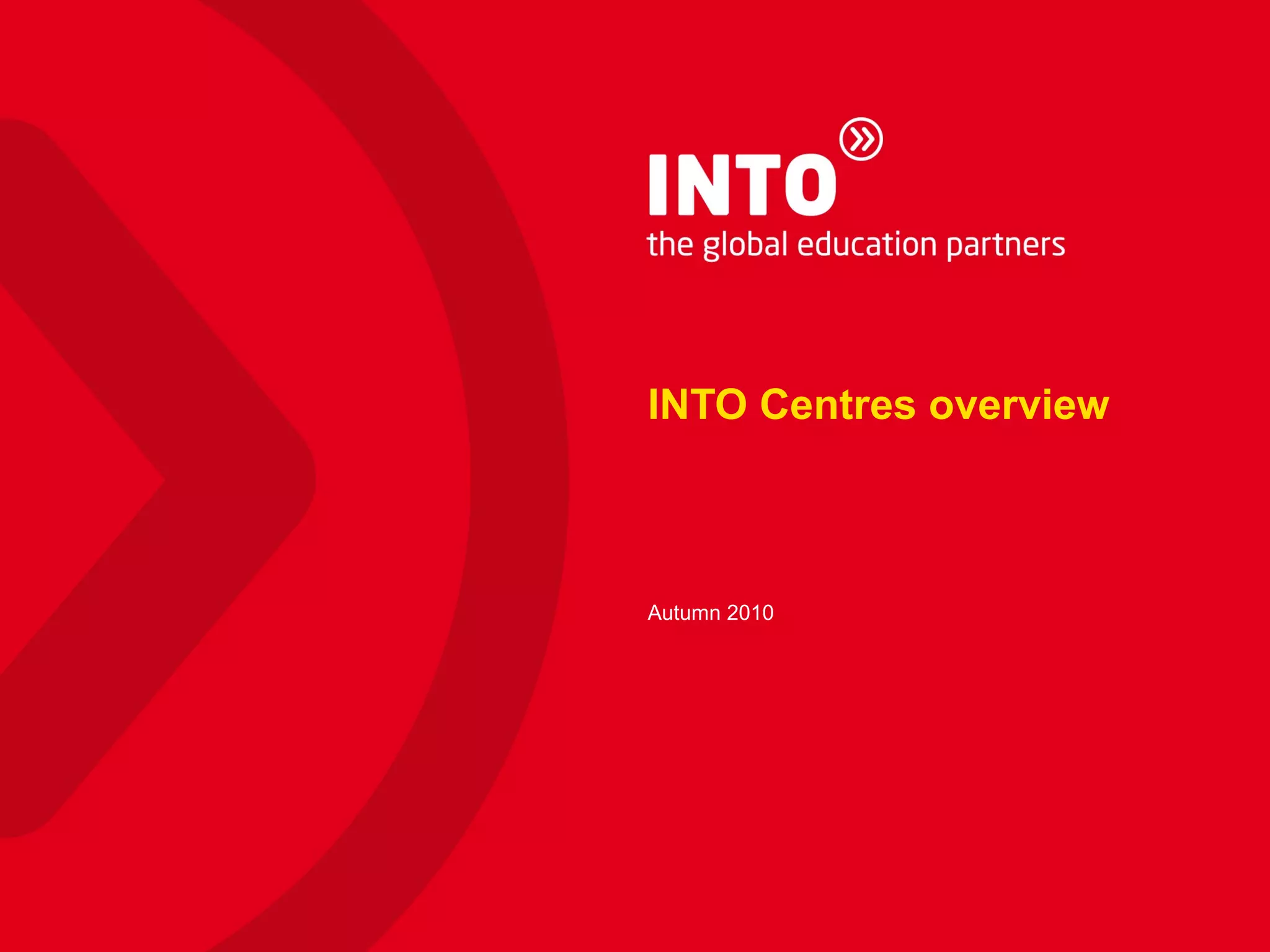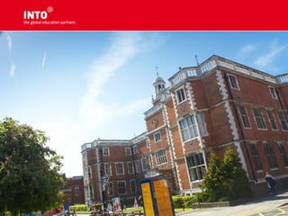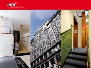 The document provides an overview of INTO Centres and their partnerships with leading UK and US universities. It describes INTO programs as validated pathway courses that provide international students access to higher education abroad. Specific centres and partner universities are highlighted, including information on their rankings and facilities. Requirements for English proficiency and application processes are also outlined.
