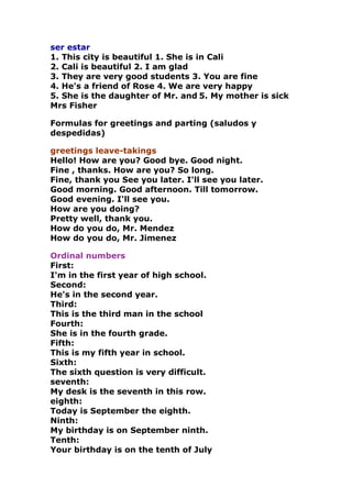 1. The document provides information about greetings, pronouns, prepositions of place, and adverbs of frequency. 2. Examples are given for common greetings like hello and goodbye, as well as subject pronouns like I, you, and they. 3. Location words like near, far from, and away are explained with examples talking about distances from schools. 4. An exercise asks questions using adverbs like sometimes, often, and never to inquire about movie going, dancing, and other activities.