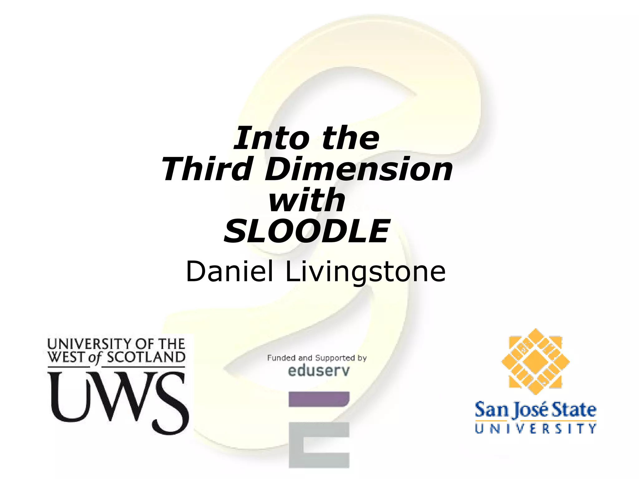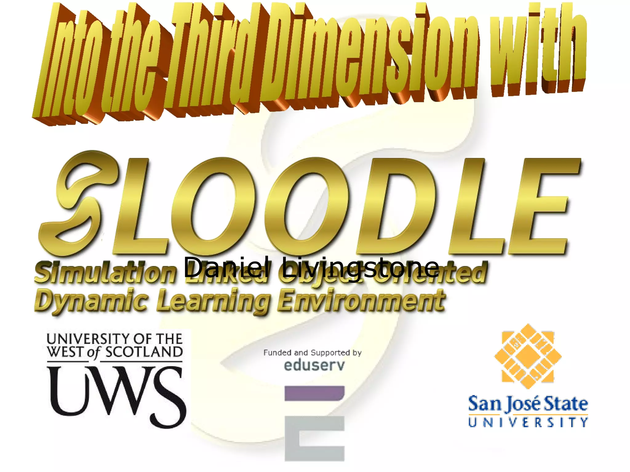Sloodle is a virtual learning environment that integrates the 3D virtual world of Second Life with the learning management system Moodle. It allows for teaching and learning activities like disseminating course materials, submitting assignments, online assessments, and collaborative activities to take place across these two platforms. While early experiences with teaching in Second Life found it too open-ended and distracting, Sloodle aims to provide more structure and goals for learning. It includes tools like a virtual drop box, quiz chair, and presentation area to support educational activities within Second Life linked to a Moodle course. Sloodle has been used in a variety of subject areas by hundreds of teachers internationally and continues to develop its features and community.