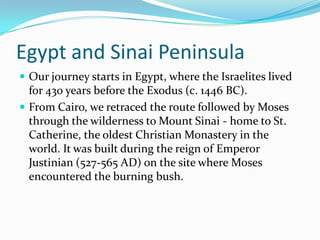 The document summarizes a tour of biblical sites related to the Israelite Exodus from Egypt. It describes locations along the route the Israelites took, including Mount Sinai where Moses received the Ten Commandments, Petra in Jordan, the Sea of Galilee where Jesus performed miracles, and Jerusalem and Bethlehem. It also provides maps showing the route and comparisons of the size of Israel to the US state of Georgia.