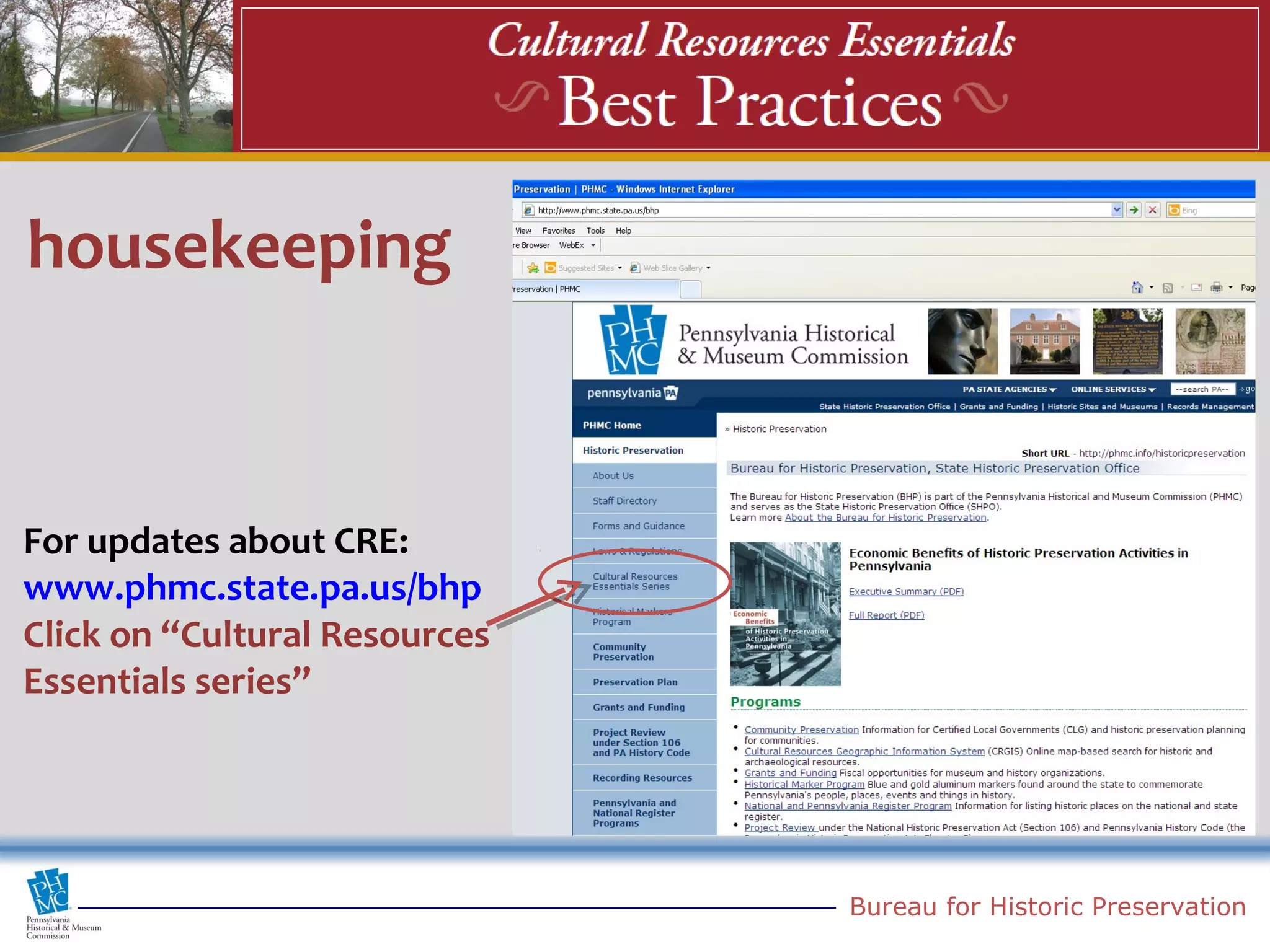This document provides an agenda and summaries for a presentation on best practices for transportation projects from the perspective of the Pennsylvania Bureau for Historic Preservation. The agenda includes updates on cultural resources essentials, a project involving Pennsylvania transportation and heritage, and a long range transportation planning partnership. The presentation discusses the bureau's new programmatic approach, increasing public involvement and transparency while streamlining processes. It also outlines the bureau's vision of promoting historic preservation statewide.