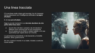 Il documento discute il futuro dell'intelligenza artificiale (IA), sottolineando la necessità per gli individui di adattarsi ai cambiamenti tecnologici e alle sfide etiche che l'IA comporta. Sottolinea l'importanza di sviluppare competenze complementari per lavorare insieme all'IA, evidenziando le differenze tra intelligenza artificiale basata su regole, apprendimento automatico, deep learning e generative AI. Viene anche evidenziata la questione dell'allineamento etico dell'IA, in particolare per le intelligenze generali artificiali, e la responsabilità umana nel suo sviluppo e utilizzo.