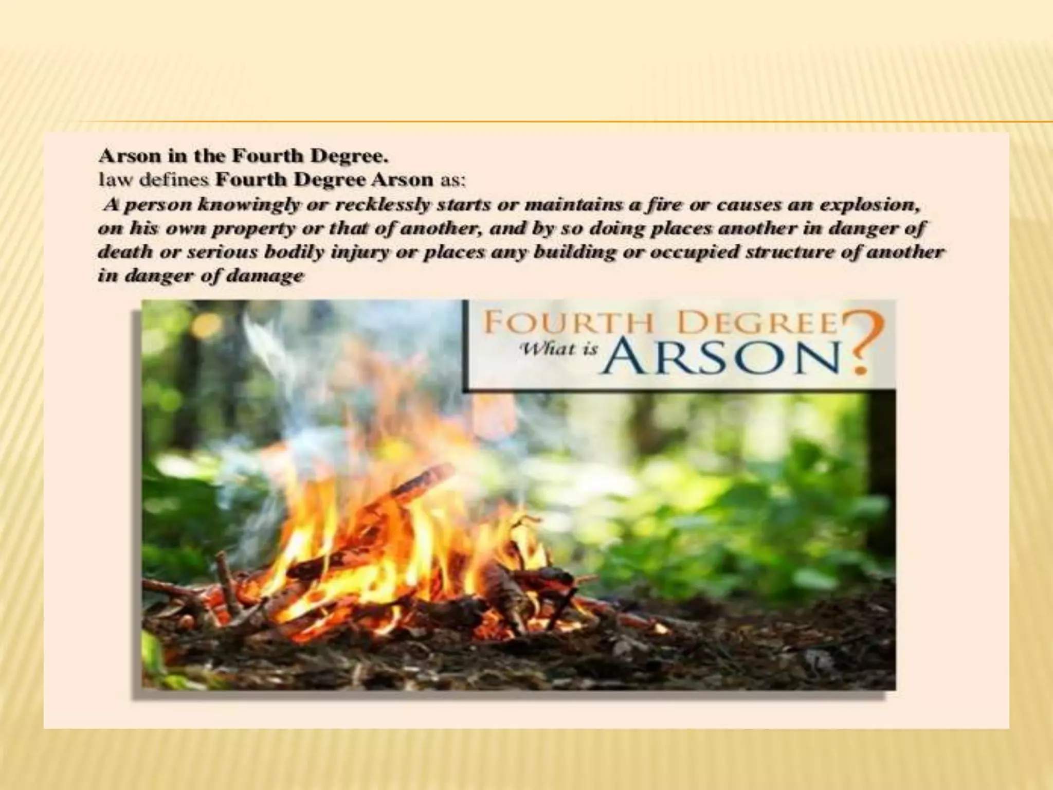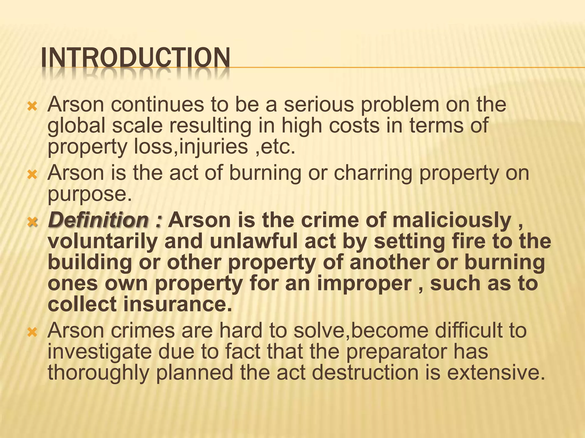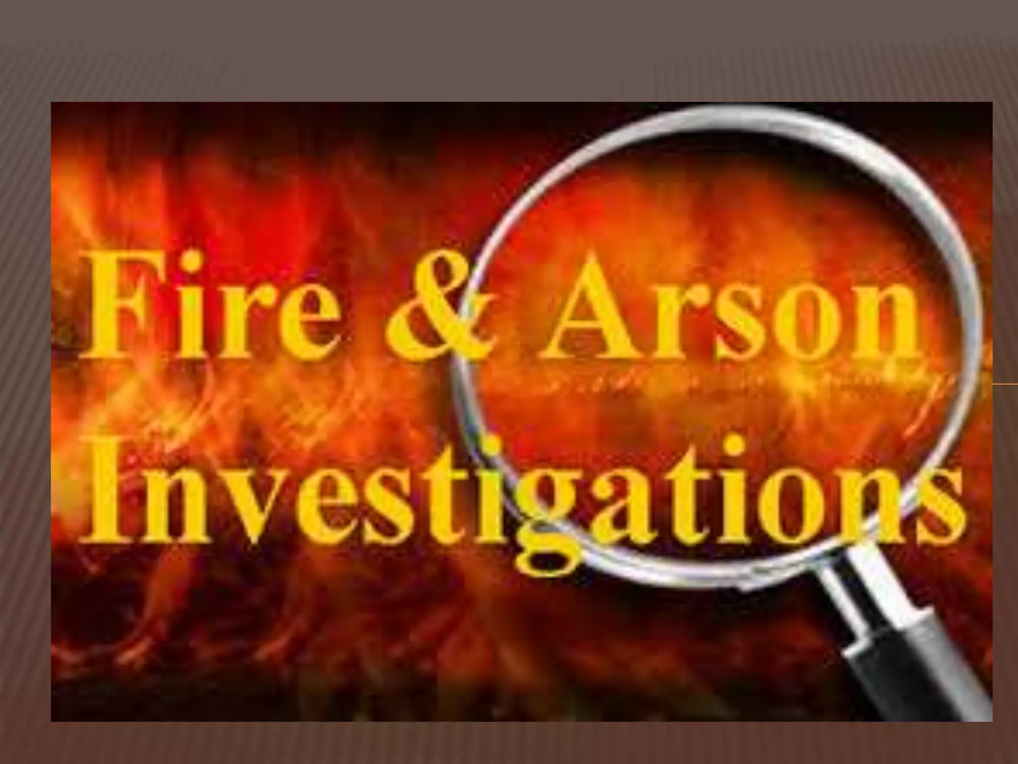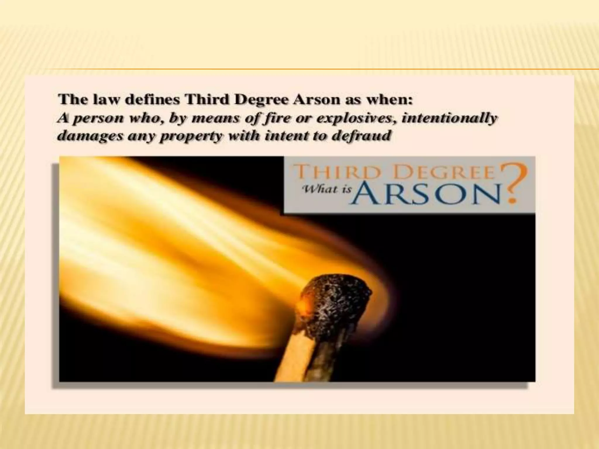 This document discusses arson, including its definition, investigation, causes, and laws around it. Arson is the deliberate act of burning property and is difficult to solve due to planning by the perpetrator. A fire investigator's role is to analyze evidence from the scene to determine if the fire was accidental or intentional. There are various motives for arson such as vandalism, crime concealment, and profit. Laws define degrees of arson based on the property burned. Fire investigations aim to determine the cause to prevent future fires and identify those responsible.