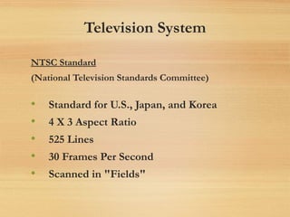 This document provides an overview of television production, including the different television systems, the four stages of production, and roles of the production staff and crew. It discusses the NTSC, PAL, and SECAM television standards and aspects of HDTV. The four stages of production are outlined as pre-production, setup and rehearsal, production, and post-production. Key roles of the producer, director, and other staff are defined. The document also covers producing for television, including the responsibilities of staff and independent producers in developing program ideas, budgets, and selling concepts.