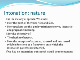 The document discusses intonation in speech, including how pitch, stress, and tone are used to convey linguistic and pragmatic meaning. It covers topics like the rhythm of speech, parasodic features, whether English is a tonal language, the three types of decisions speakers make regarding tonality, tonicity and tone. It also describes falling tones, rising tones, fall-rising tones, and their functions in English.