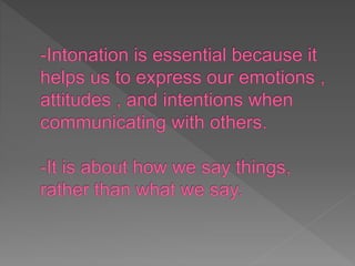 This document discusses rising and falling intonation in English. Rising intonation occurs when pitch goes up at the end of a sentence, inviting the speaker to continue. It is used with yes/no questions and question tags that are real questions. Falling intonation has pitch falling at the end and is most common in English, used with statements, commands, wh-questions, confirmatory question tags and exclamations. Examples of each intonation pattern are provided.
