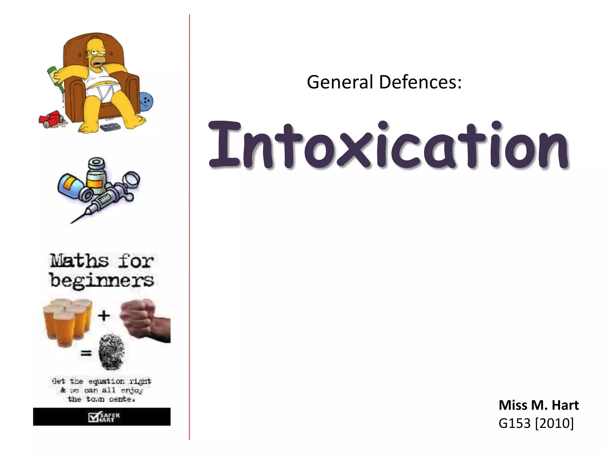 1. The document discusses the role of intoxication as a defense in criminal cases. Intoxication is not a true defense but is sometimes argued to negate intent.