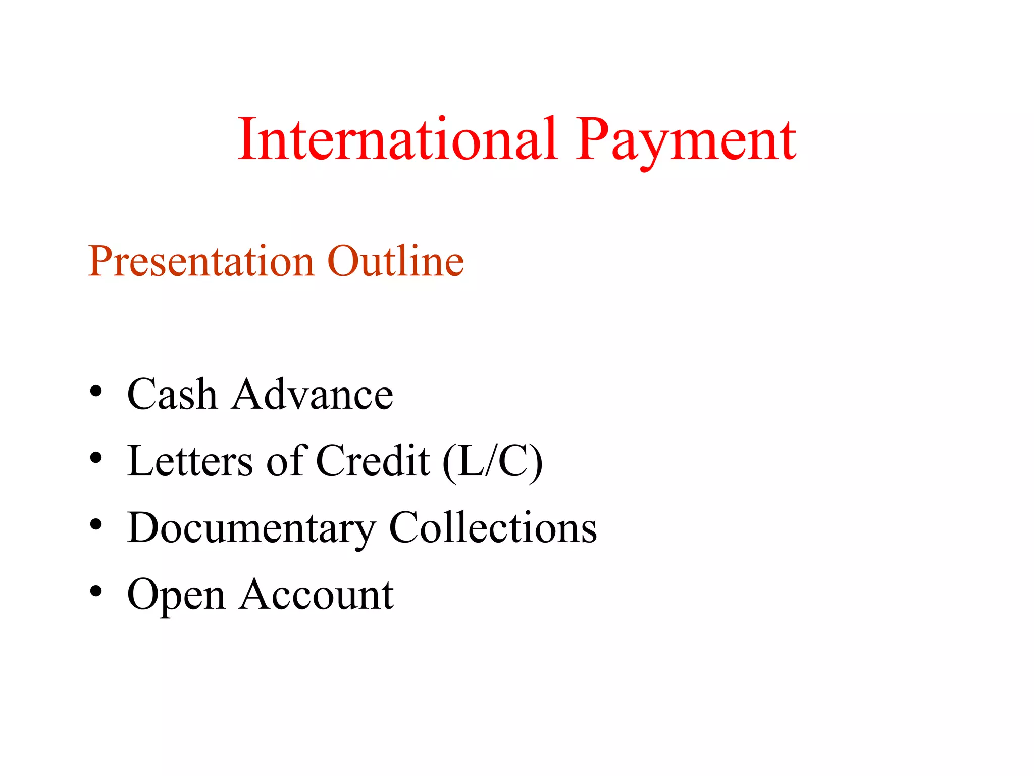 This document provides an overview of international payment methods, including cash in advance, letters of credit, documentary collections, and open account. It discusses the advantages and disadvantages of each method from the perspective of both buyers and sellers. Letters of credit are described in more detail, outlining the key parties involved, steps to obtain an L/C, required documents, and potential issues that can arise. Export incentive programs from the US are also briefly outlined.