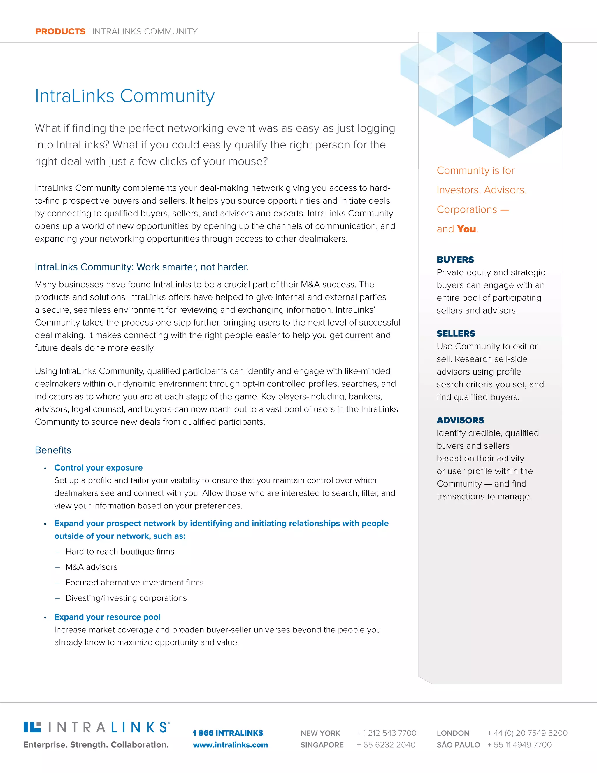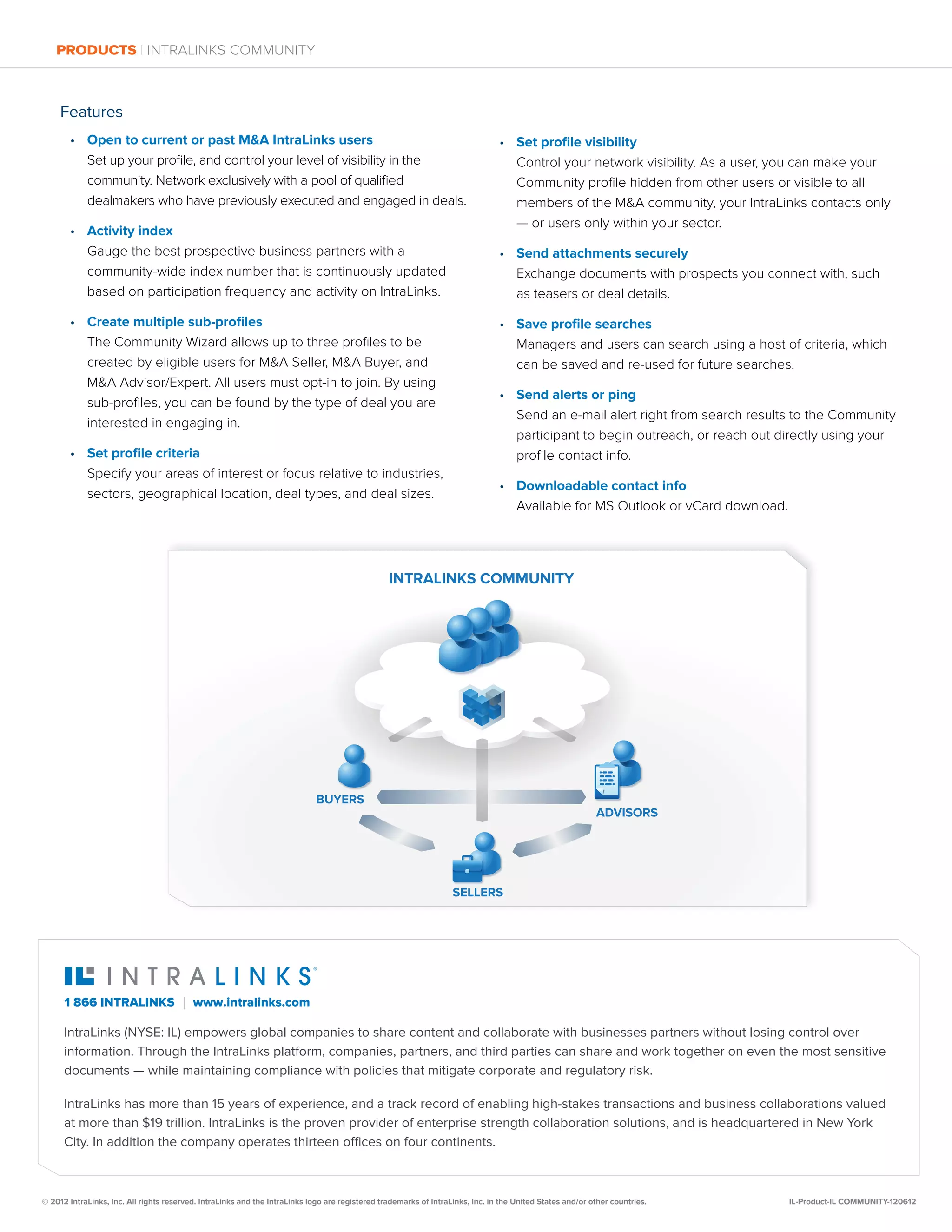 IntraLinks Community is a networking platform that allows users to connect with prospective buyers, sellers, advisors, and experts for deal-making opportunities. It provides profiles, searches, and activity indicators to help qualified participants identify and engage with other dealmakers. The platform aims to expand users' prospect networks and resource pools beyond their existing contacts to maximize opportunities and value. Key features include controlling profile visibility, measuring participant activity, and exchanging documents and contact information securely.
