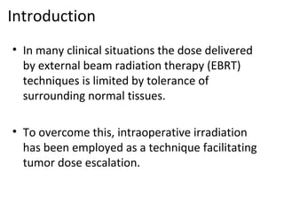 1. Intraoperative radiotherapy (IORT) delivers a high single dose of radiation during surgery to the tumor bed or residual tumor. This allows dose escalation while minimizing exposure to surrounding healthy tissues, which are displaced or shielded.