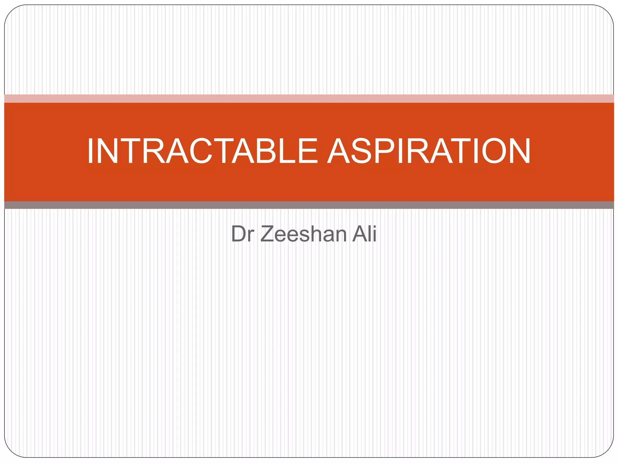 The document outlines the definition, causes, symptoms, examinations, and management of intractable aspiration, emphasizing laryngeal penetration of gastric secretions. It discusses various conditions leading to aspiration, diagnostic methods, and treatment options, including conservative strategies and surgical interventions. Additionally, it addresses specific concerns regarding aspiration in neonates and related investigations.