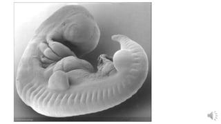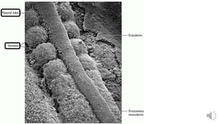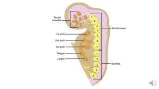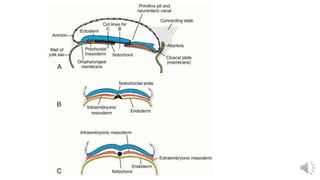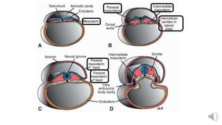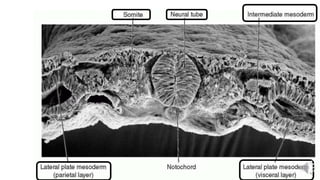The document discusses the development of the mesoderm germ layer during embryogenesis. It notes that the mesoderm initially forms three layers - paraxial, intermediate, and lateral plate mesoderm. The paraxial mesoderm segments into somites which further differentiate into sclerotome, myotome and dermatome tissues. The intermediate mesoderm forms urogenital structures while the lateral plate mesoderm splits into somatic and splanchnic layers which give rise to various tissues like muscle, bone, blood and connective tissues.