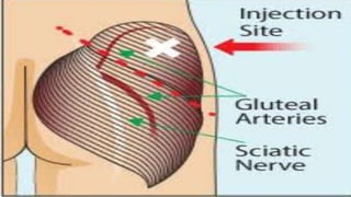 This document discusses intramuscular injections, including common injection sites like the dorsogluteal, ventrogluteal, deltoid, and vastus lateralis. It lists the necessary equipment for intramuscular injections such as a medication card, injection tray, sterile medications, needles, syringe, alcohol swabs, kidney tray, and clean gloves. The procedure involves checking the order, explaining the procedure to the client, washing hands, positioning the client, selecting and cleaning the injection site, injecting the medication using a Z-track technique.