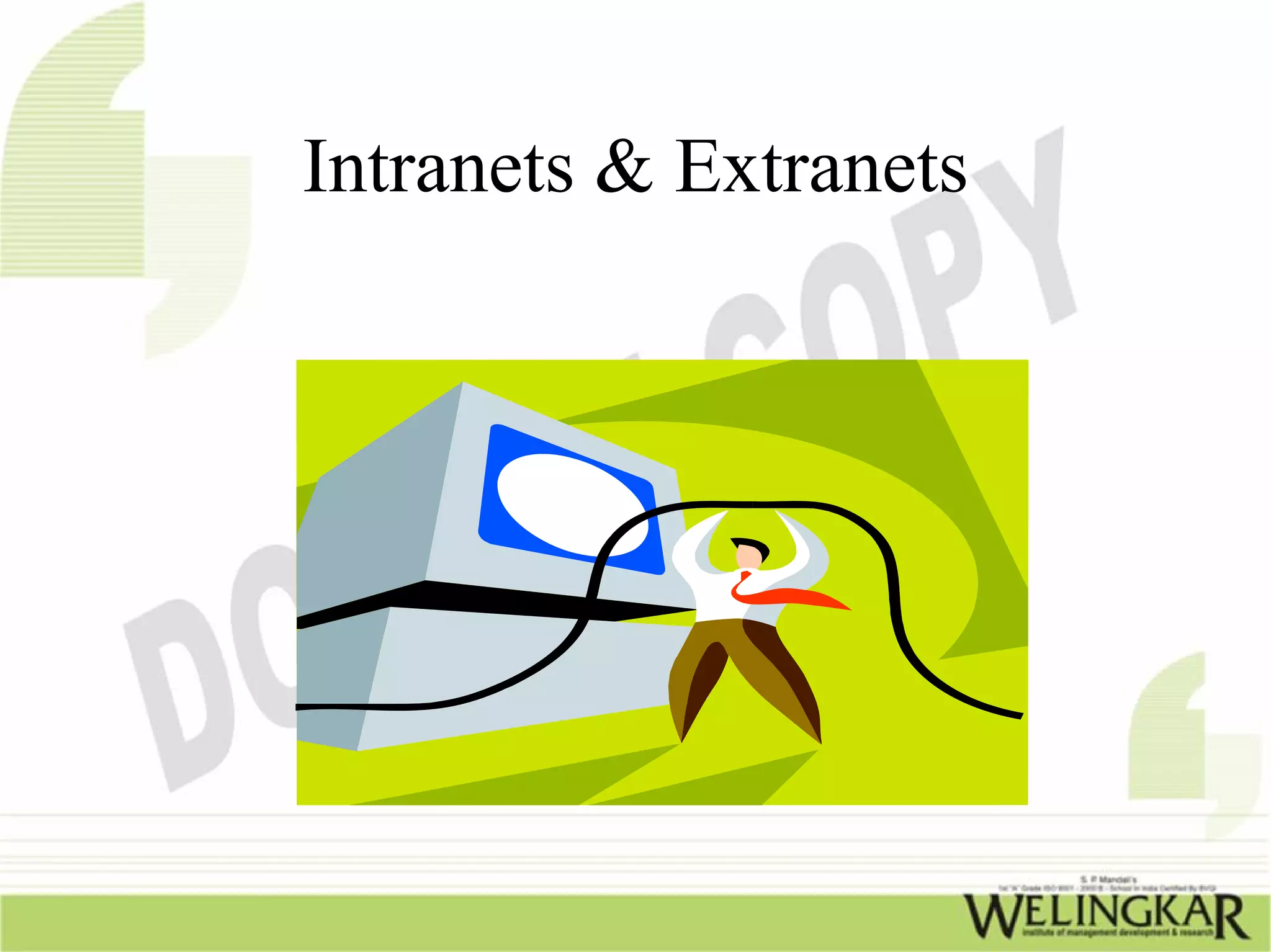 The document discusses the structure, policies, and management of intranets and extranets within information technology. It highlights various applications such as employee productivity, knowledge management, and secure communications, and outlines the roles of hardware like firewalls and routers in facilitating these systems. Additionally, it mentions the importance of adapting to change and improving information delivery across corporate networks.