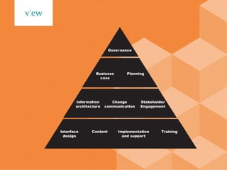 The document discusses the evolution of intranets and outlines key strategies for effective intranet management, focusing on stakeholder communication, content strategy, and governance. It highlights the importance of aligning intranet objectives with overall business goals and establishing clear governance structures to avoid common pitfalls. Case studies illustrate how strong governance can lead to significant cost savings and improved user experience.