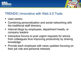 The document discusses the evolution of intranets towards user-centric designs that integrate collaboration, communication, and self-service tools, leveraging Web 2.0 technologies. It highlights best practices for intranet development, including the importance of management support, user feedback, and usability studies to enhance productivity and employee satisfaction. Additionally, it compares different enterprise software solutions, like SharePoint and SaaS platforms, noting their pros and cons for organizations implementing intranet systems.