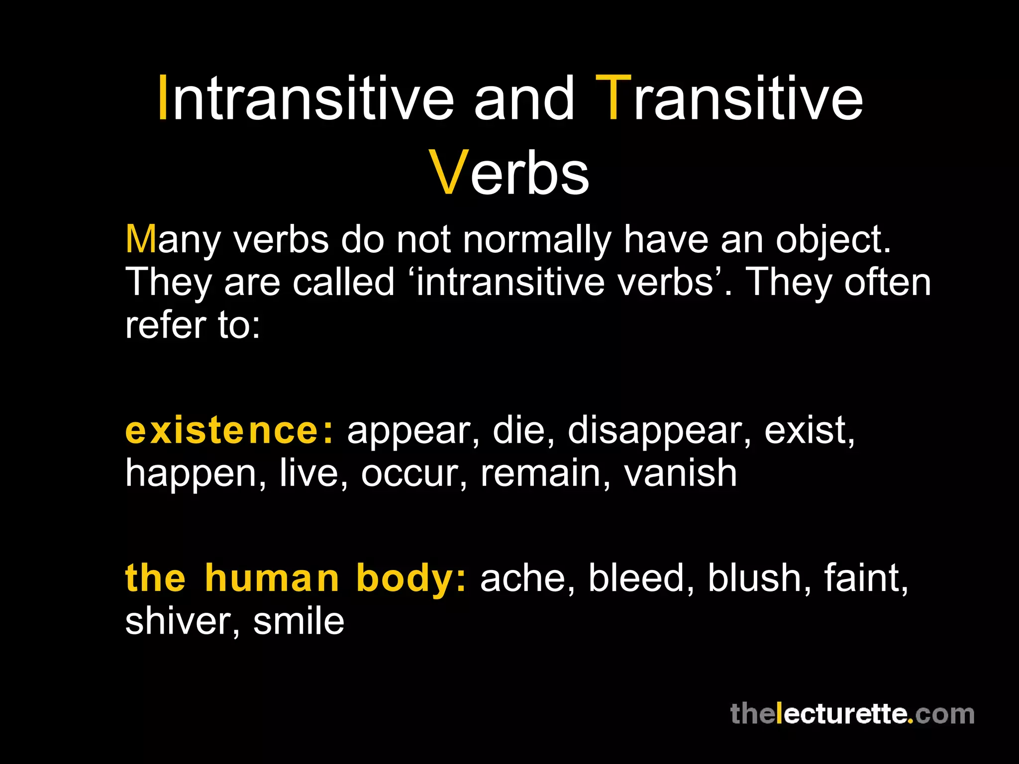 The document explains the distinction between intransitive and transitive verbs, defining intransitive verbs as those that do not have an object, while transitive verbs do. It provides examples of each type and notes that some verbs can function as both, depending on their meaning. Additionally, it highlights specific cases where certain transitive verbs cannot be used in the passive voice.