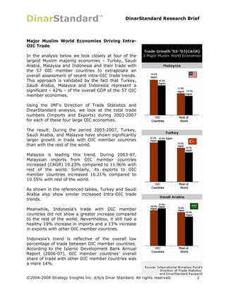 This document discusses increasing trade and investment between Organization of Islamic Cooperation (OIC) member countries. It finds that Malaysia, Turkey, and Saudi Arabia have seen significantly higher growth in trade with other OIC members than with the rest of the world between 2003-2007. Key drivers of this trend are the strong economic growth and emerging market status of many OIC countries, as well as forums promoting business and economic cooperation between Muslim-majority states. Events like the annual World Islamic Economic Forum have helped connect entrepreneurs and increase partnerships within the OIC community.