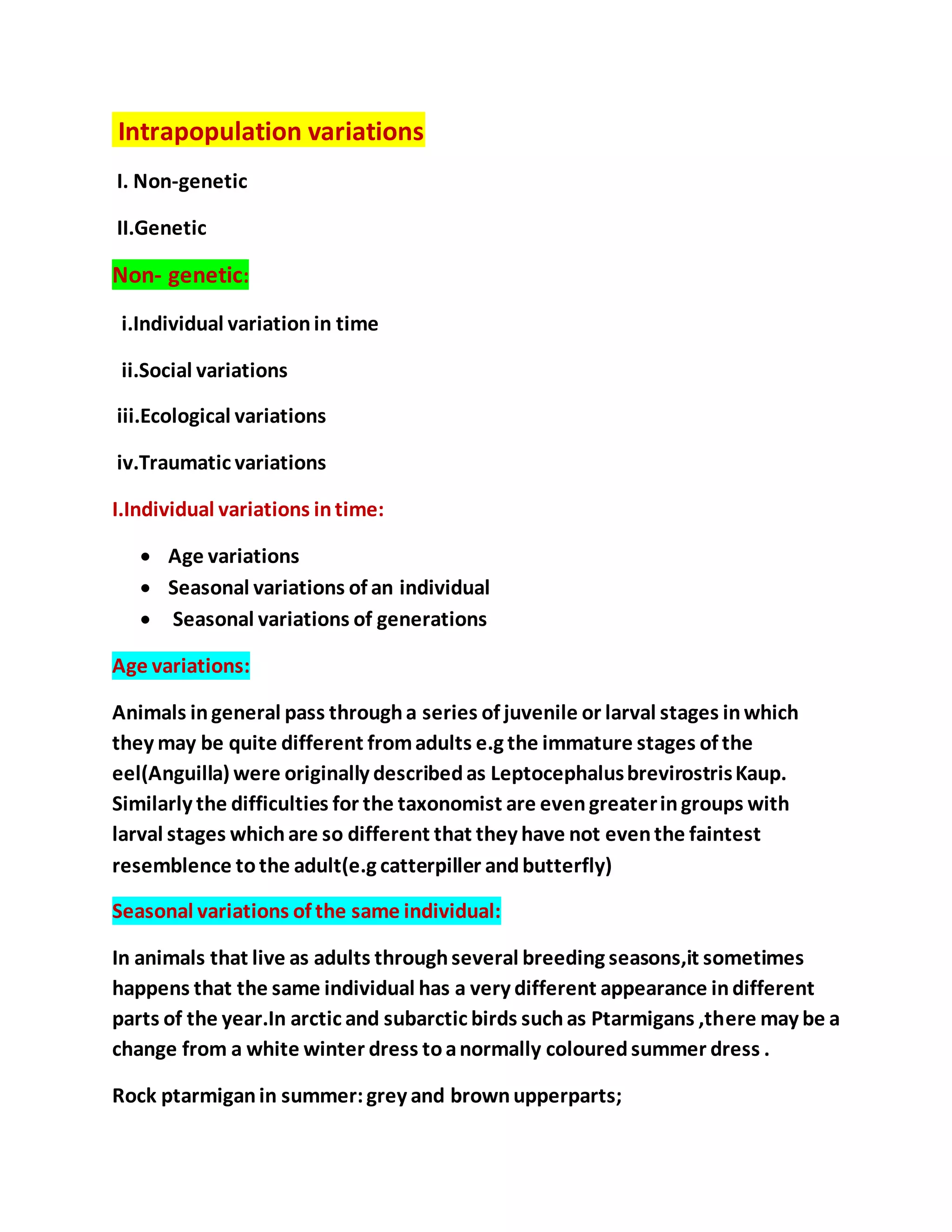1. Intrapopulation variations can be genetic or non-genetic. Non-genetic variations include individual, social, ecological, and traumatic variations.