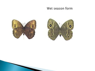 This document discusses different types of biological variations that can occur in animals, including genetic, non-genetic, individual, social, ecological, traumatic, age-related, seasonal, and polyphenic variations. It provides examples of variations in appearance between juvenile and adult stages, between seasons, and in response to environmental conditions. It also summarizes variations that can occur between sexes, castes in social insects, populations in different habitats, in response to atypical environmental conditions, and those that involve allometric growth or neurogenic color changes.