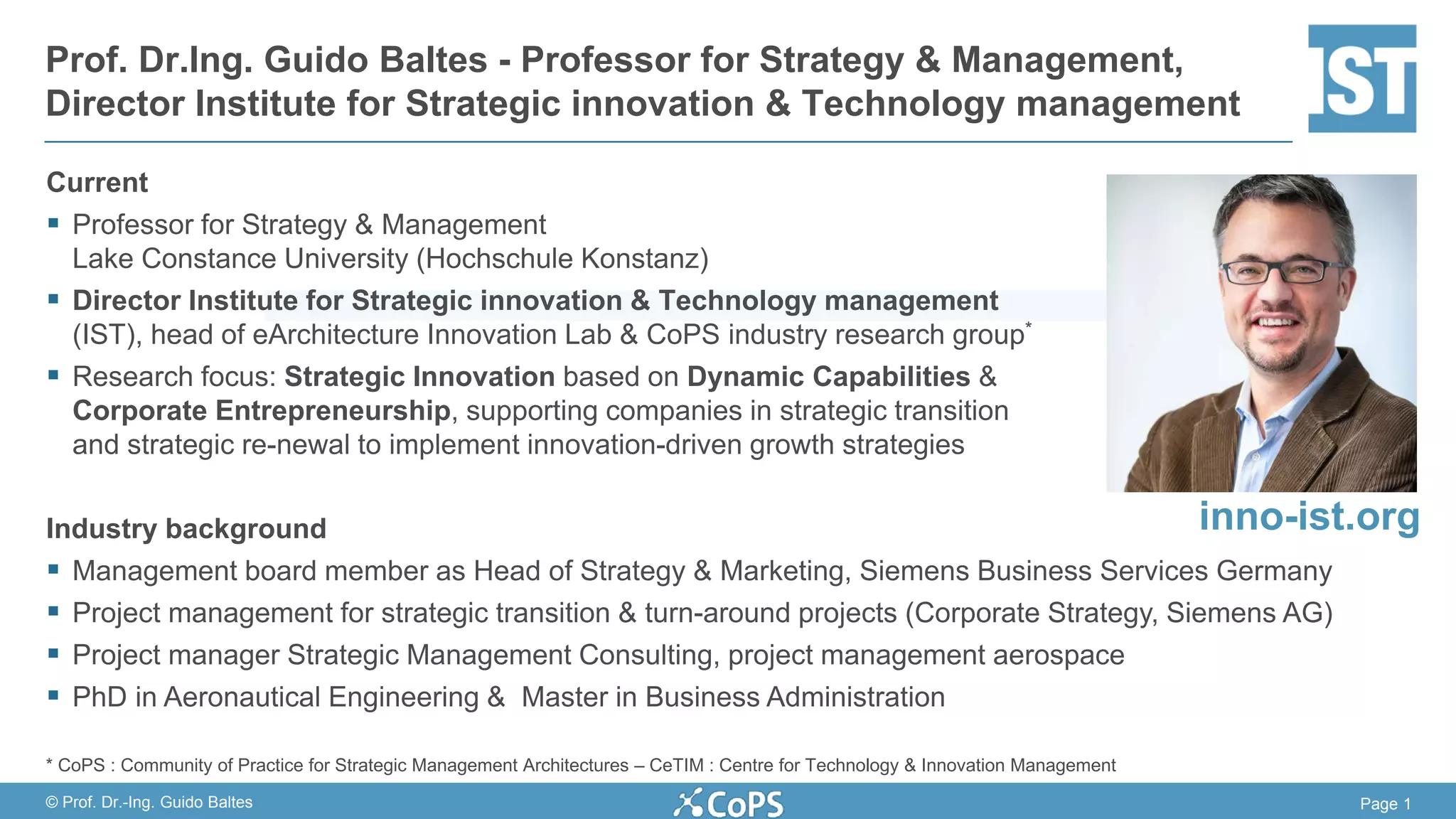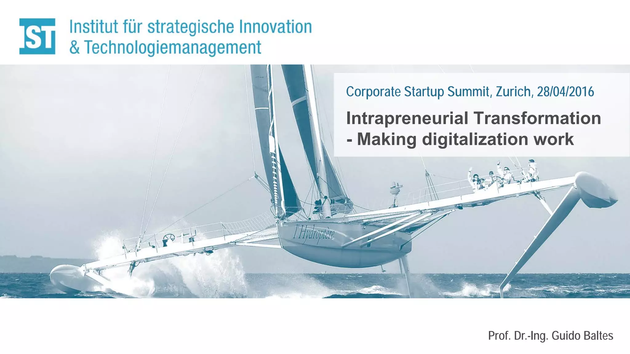 Prof. Dr.-Ing. Guido Baltes presented on intrapreneurial transformation and making digitalization work. He discussed how digitalization is driving disruptive change and discussed the need for companies to develop ambidextrous organizations that can efficiently manage their core business while also driving digital innovation through entrepreneurial teams. He emphasized that the role of entrepreneurial team managers is key to successfully implementing innovation through an iterative process involving technology, products, and business models. Top management must focus on pushing entrepreneurial teams to quickly implement ideas to succeed in today's fast-paced digital environment.