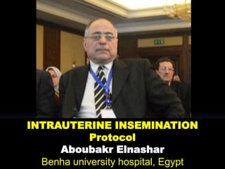 This document outlines the protocol for intrauterine insemination (IUI). It describes the indications for IUI including male factor infertility and various types of female infertility. It details the workup that should be done prior to IUI including semen analysis and ultrasound exams. The steps of the IUI process are explained, including ovarian stimulation when needed, follicle monitoring, sperm preparation techniques, timing of insemination, and the insemination procedure. It recommends offering 4 to 6 cycles of IUI.