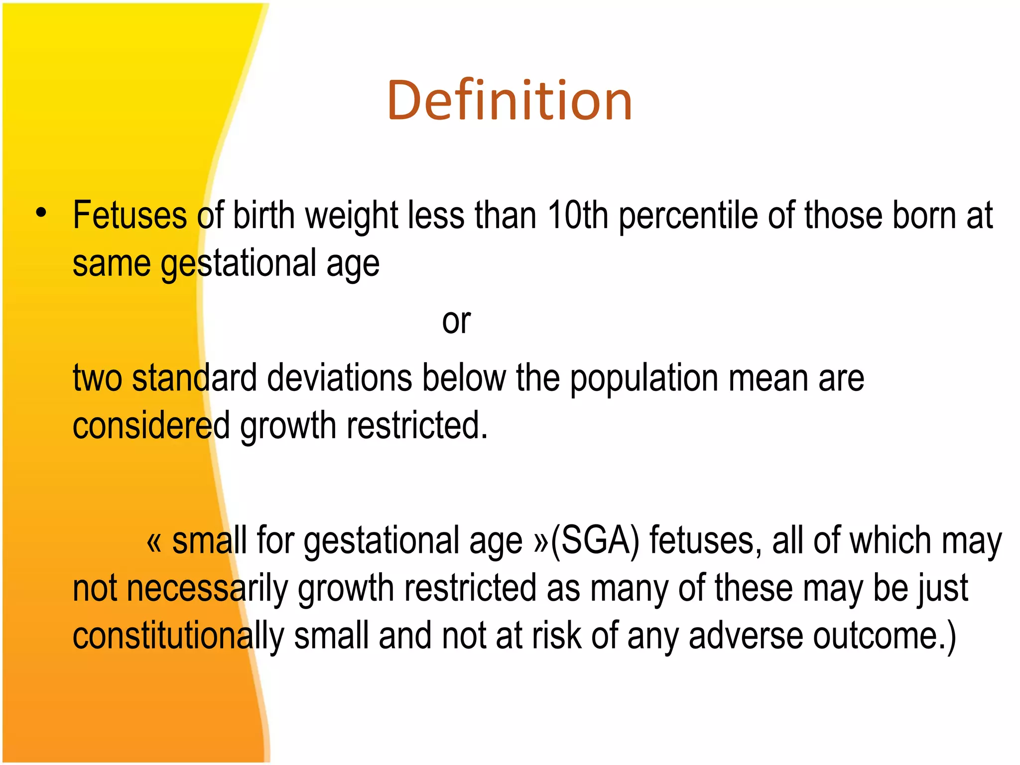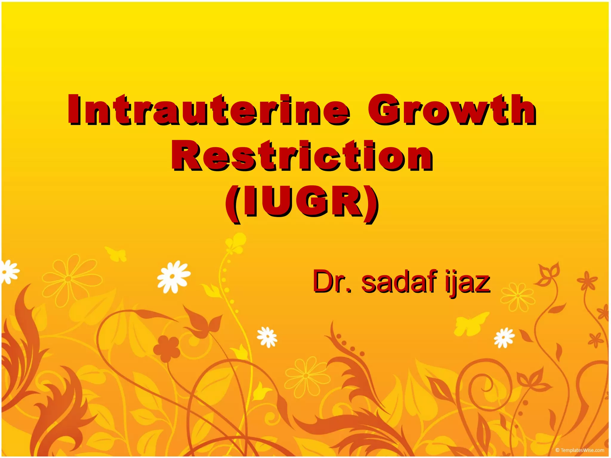 Intrauterine growth restriction (IUGR) refers to fetuses that are small for their gestational age. It can be symmetric/intrinsic or asymmetric based on whether all growth parameters are proportionally small or whether the head is spared. Symmetric IUGR is caused by early placental insufficiency affecting cell number, while asymmetric IUGR occurs later from reduced nutrient/oxygen supply, sparing the brain. Diagnosis involves serial fundal height measurements, ultrasound to assess growth parameters and placental grading, and monitoring for complications like stillbirth.