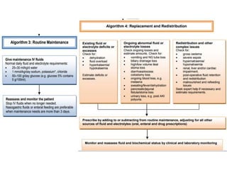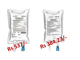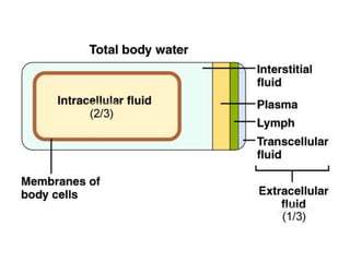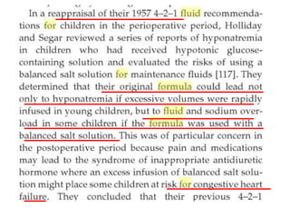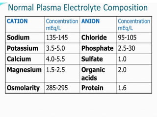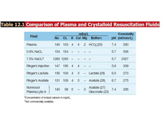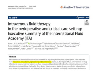 Intravenous fluid therapy is a critical component in the management of surgical and critically ill patients, especially for correcting fluid and electrolyte disturbances. The document discusses the physiology of body fluids, types of fluids used (crystalloids and colloids), and highlights the complications, advantages, and contraindications of fluid therapy. It emphasizes the evolution and contemporary issues surrounding the use of various solutions, such as normal saline, and the importance of proper fluid selection to avoid adverse effects.