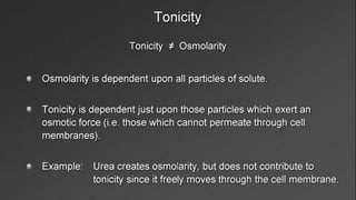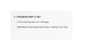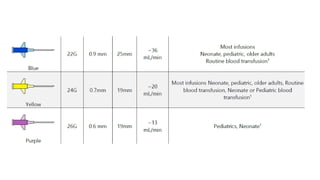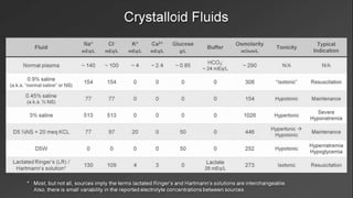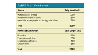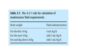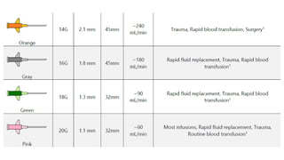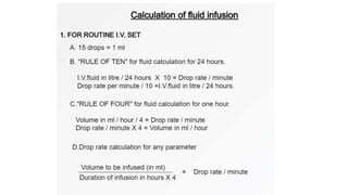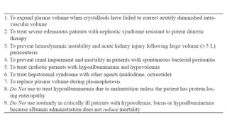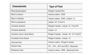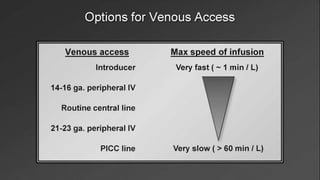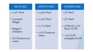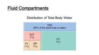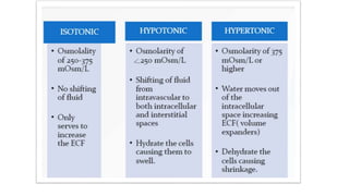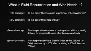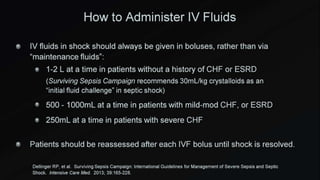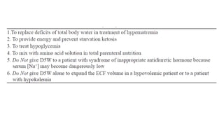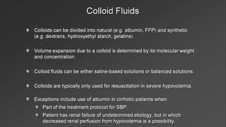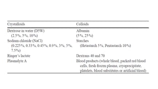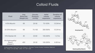 Physical exam findings of hypovolemia include decreased skin turgor, dry mucous membranes, orthostatic hypotension, and decreased jugular venous pressure. Signs of fluid overload include shortness of breath, edema, elevated jugular venous pressure, and crackles. Intravenous fluids are used for hydration, shock, and as vehicles for medications. Crystalloids like normal saline and lactated ringer's are used for initial resuscitation while colloids like albumin and hetastarch provide greater volume expansion over longer periods. Maintenance fluid rates are calculated based on weight and ongoing losses.