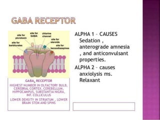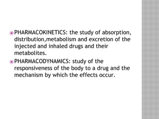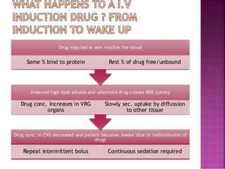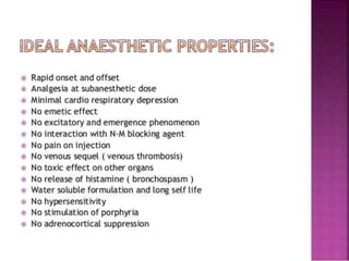 This document summarizes the pharmacokinetics and pharmacodynamics of common intravenous anesthetic agents. It discusses the mechanisms of action, metabolism, and effects of propofol, thiopental, ketamine, etomidate, and barbiturates on the central nervous system, cardiovascular system, and respiratory system. It also provides information on their uses, dosages, and side effects. The document is presented by Dr. Suchetha S with Dr. Sagar S.M as moderator and Dr. Arun Kumar A as head of department.