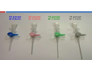 Intravenous (IV) therapy involves infusing liquids directly into veins. It has been used since the 1830s to treat cholera. Common uses of IV therapy include fluid replacement, medication delivery, blood transfusions, and total parenteral nutrition. IV fluids are categorized as crystalloids or colloids and can be isotonic, hypotonic, or hypertonic depending on their concentration of electrolytes. Various devices are used for IV access including needles, peripheral IV lines, central lines, and implanted ports. Precise control of infusion rates requires pumps. Potential risks include infection, phlebitis, infiltration of tissues, and embolisms.