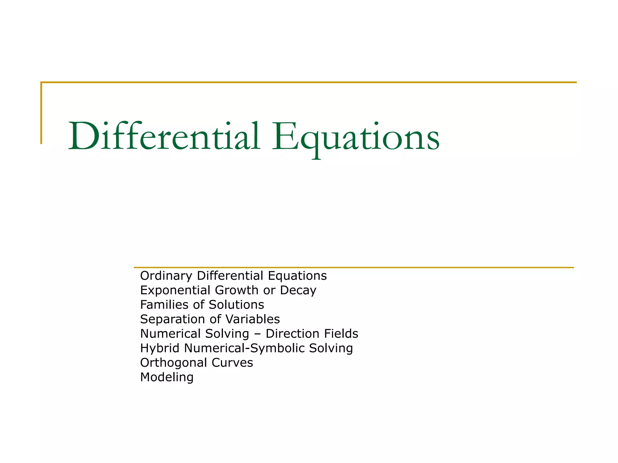 The document discusses ordinary differential equations, including exponential growth/decay models, separation of variables, numerical and hybrid numerical-symbolic solving techniques, orthogonal curves, Newton's law of heating and cooling, and medical modeling examples. Specific examples are provided to illustrate concepts like families of solutions, implicit solutions, direction fields, and determining parameter values from initial conditions.