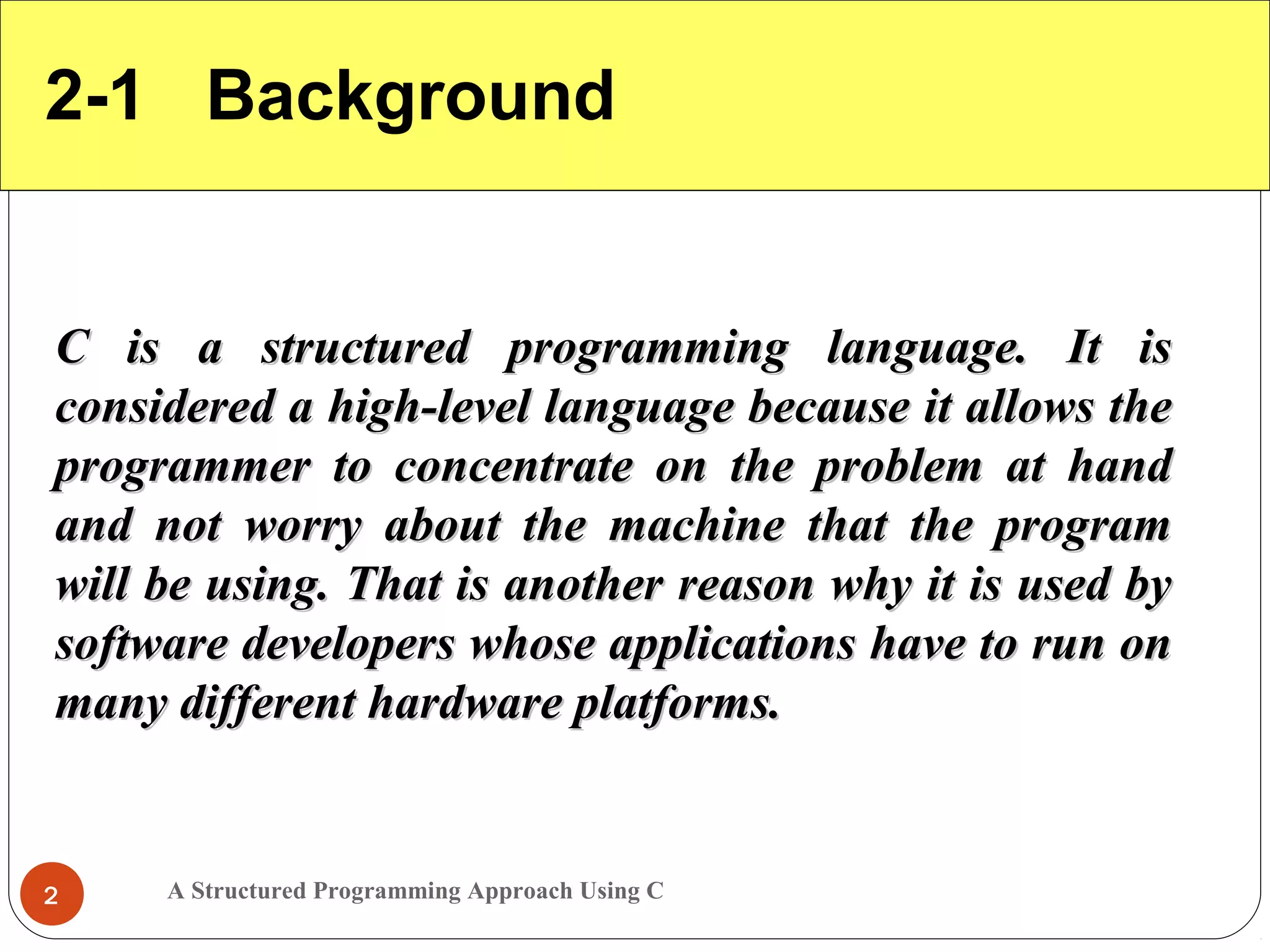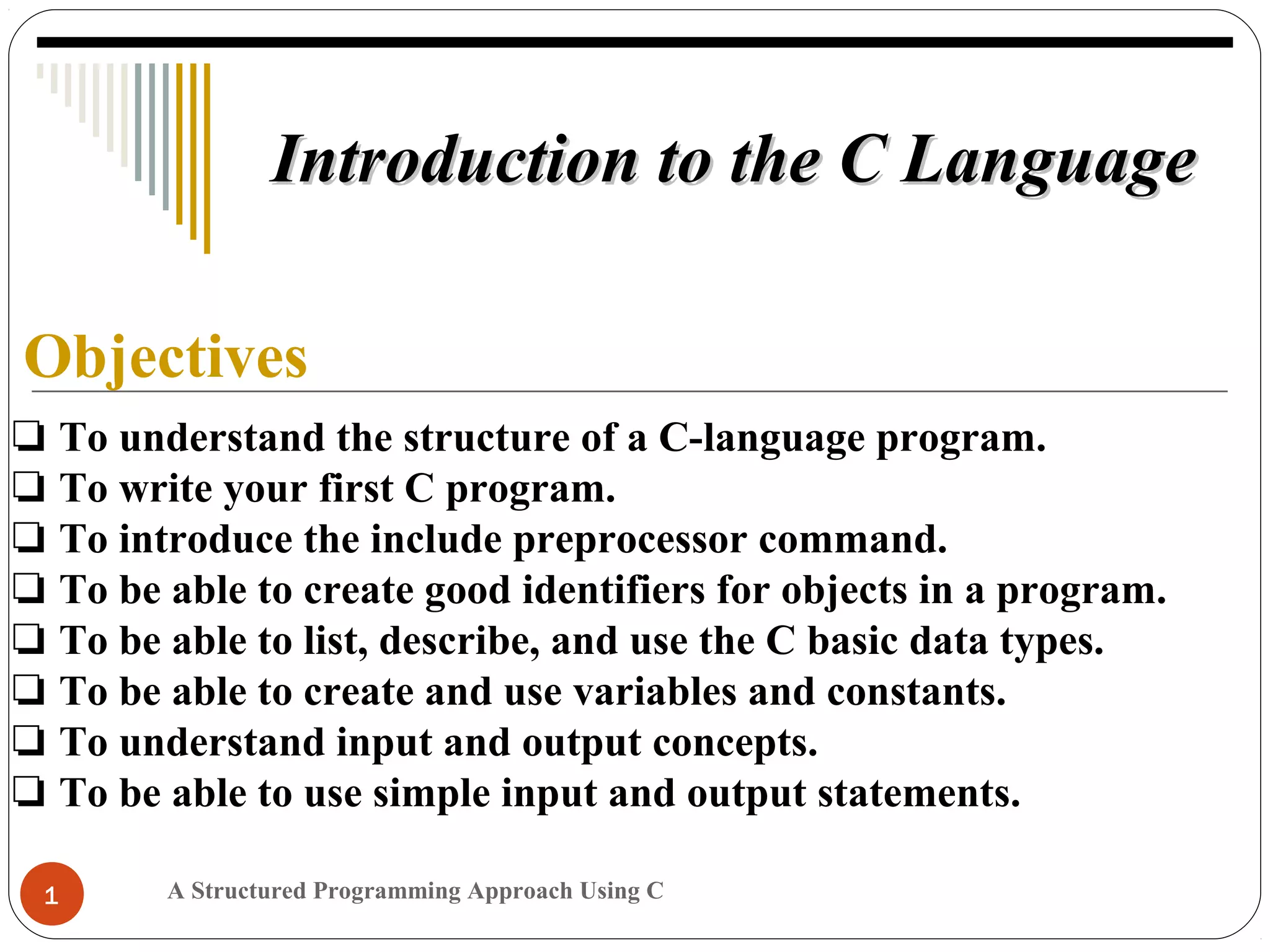 This document provides an introduction to the C programming language. It outlines the objectives of learning C which include understanding the structure of C programs, writing basic C programs, using variables and data types, and performing input and output. The document then covers various aspects of C in more detail such as the structure of C programs, using identifiers, basic data types, variables, constants, and input/output statements. It provides examples to illustrate concepts like variable declaration, arithmetic operators, and precedence.