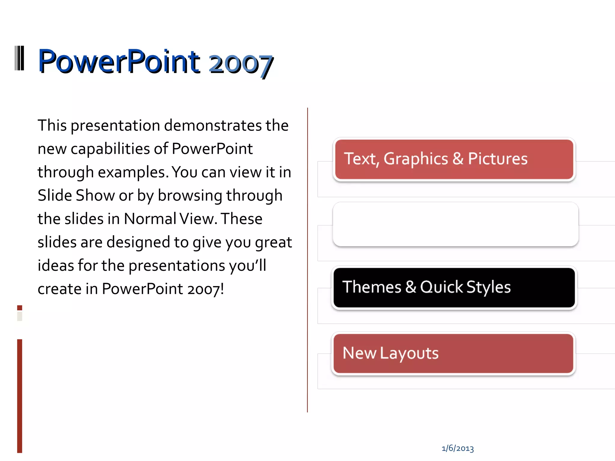 This document provides an overview of new features in PowerPoint 2007. It demonstrates enhanced text formatting options like strikethrough and character spacing control. Graphics can now have effects like soft shadows and 3D applied. Pictures can be recolored or have their frames changed. SmartArt allows turning bullet points into graphical representations. Themes provide coordinated colors, fonts and effects across Office applications. Layouts offer more presentation options and custom layouts allow arranging content as desired.