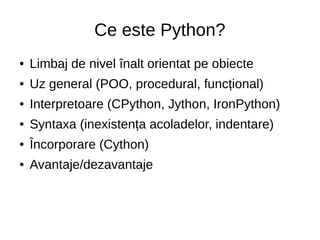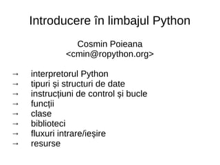The document introduces the Python programming language. It discusses Python's interpretor, data types like integers and strings, control structures like if/else statements and for loops, functions, classes, libraries, and input/output. It provides examples of key Python concepts like boolean logic, lists, dictionaries, regular expressions, and socket programming.